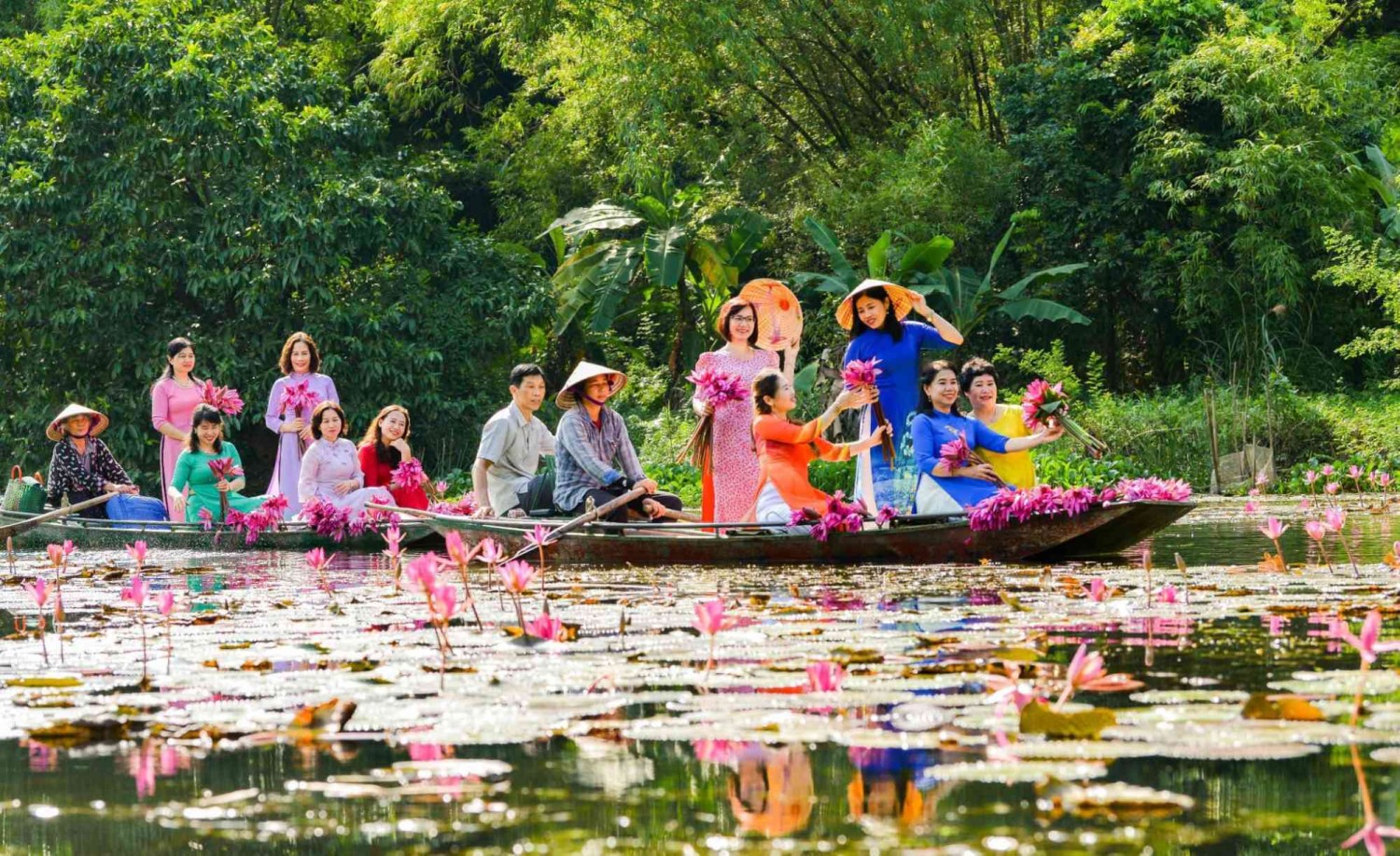 Tại đầm Vân Long Ninh Bình, những chiếc thuyền nan do người dân địa phương chèo sẽ đưa du khách lướt nhẹ trên mặt nước phẳng lặng. Con thuyền di chuyển chậm rãi giữa không gian núi đá vôi và thảm thực vật ngập nước, giúp du khách cảm nhận rõ vẻ đẹp hoang sơ của khu bảo tồn thiên nhiên.